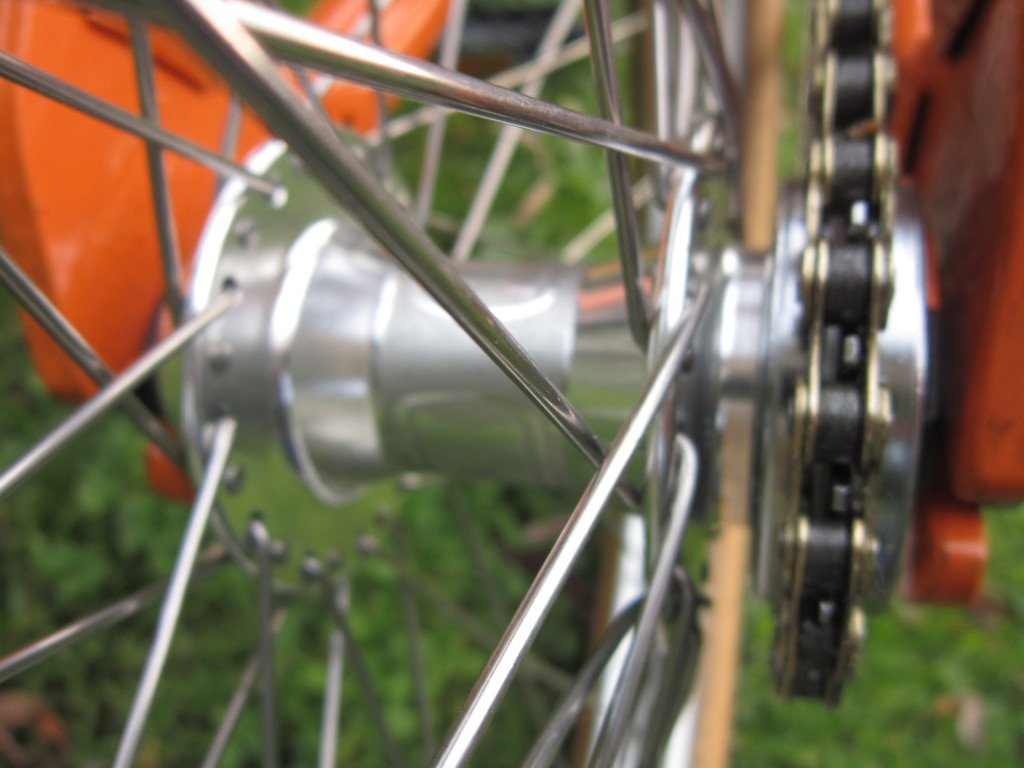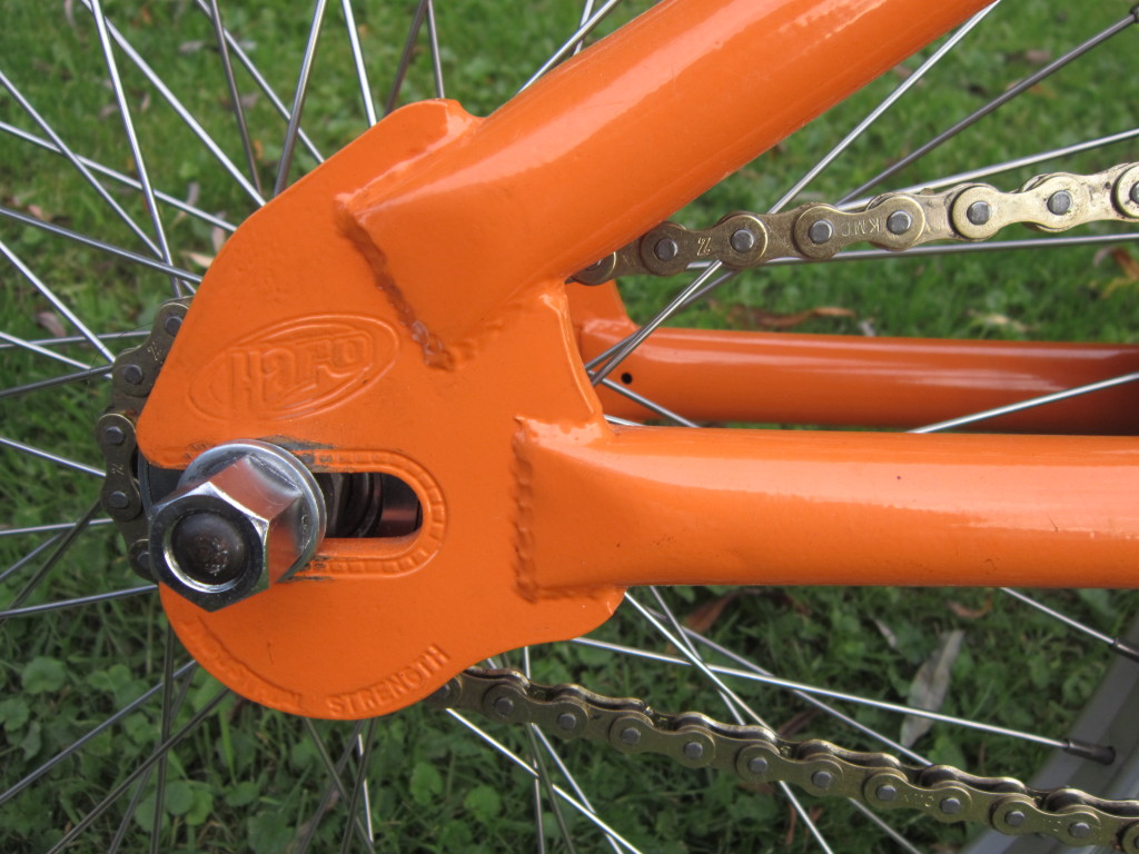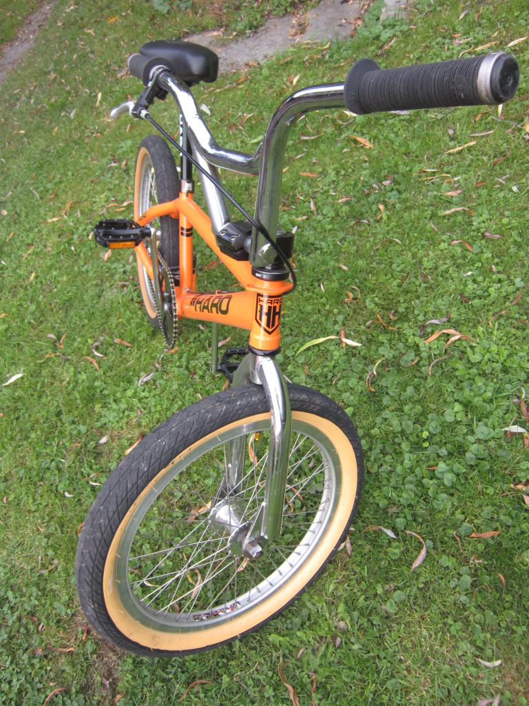 En fait le cadre était beaucoup moins lourd qu'il n'y paraissait et c'était un full CR-Mo qui méritait un peu plus d'attention,j'avais des stickers Haro et des pneus en 2,25 qui trainaient et très vite le réflexe restaurateur s'est emparé de moi:Epoxy sur cadre,plateau,tube de selle...Il a fallu changer les billes et cônes des superbes moyeux Haro Mega Hubs(axes 12mm galère à trouver!)qui méritaient bien ça,changer les rayons bien oxydés;le spad était plein de sable. Bien sur il a perdu son look Dirt pour devenir une sorte d'hybride Street à cause des boudins qui lui donnent un look de 16 pouces de loin,mais j'avoue qu'il est bien sympa à rider et assez solide pour mon poids...