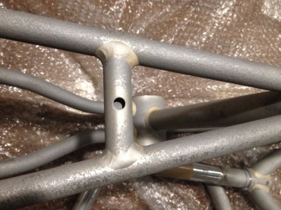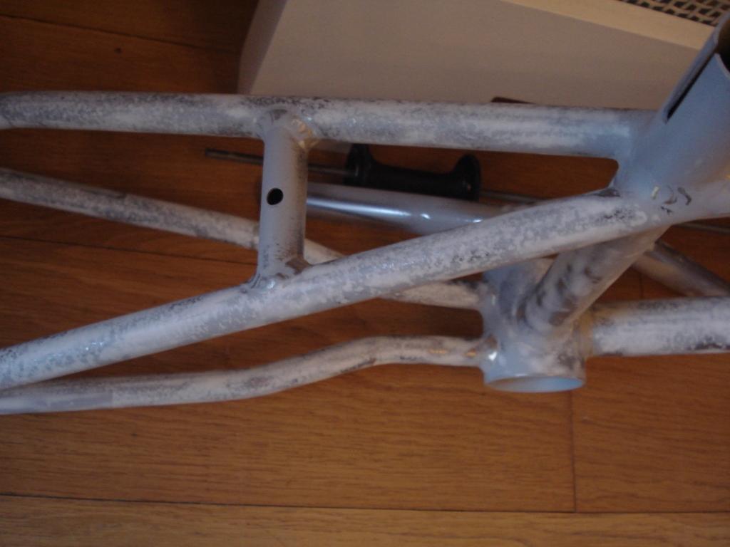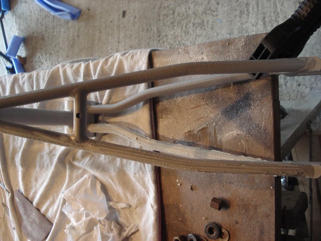 Je m'y suis remis le WE dernier, 10 heures à enduire et poncer (et oui, vu l'état, l'apprêt garnissant ne suffisait pas, et je ne voulais pas charger avec plusieurs couches, afin de garder le relief des soudures après peinture). Après ponçage: Je le dépose cette aprem en peinture...