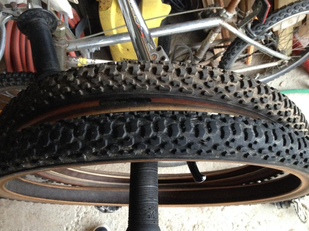 En premier plan un Wolber (pas d'autre réf sur le pneu), pas neuf celui-ci, derrière un Michelin Chamonix, ce sont les mêmes (il me semble que Wolber et Michelin, c'est la même maison)