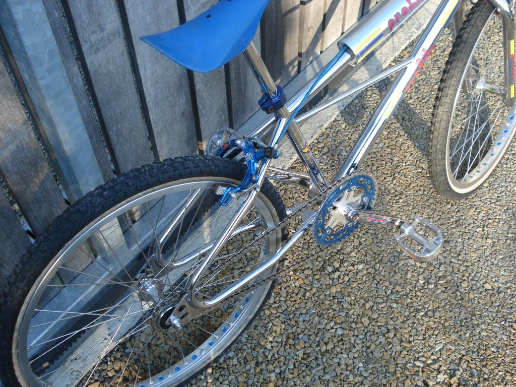 Je ne suis pas un grand fan des pièces bleues mais la ça passe vraiment bien. Et quel montage ! Super choix pour les pédales, on n'en voit pas souvent et elles rappellent les Profile, sans parler qu'elle vont parfaitement avec ce magnifique pédalier fantastiquement restauré...