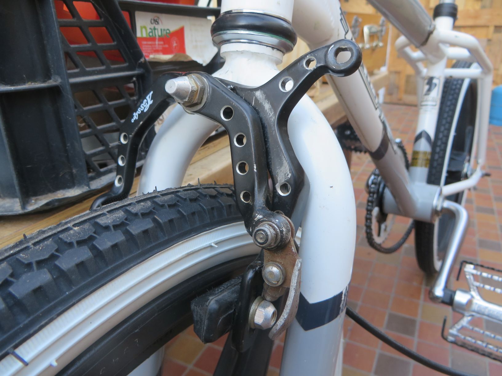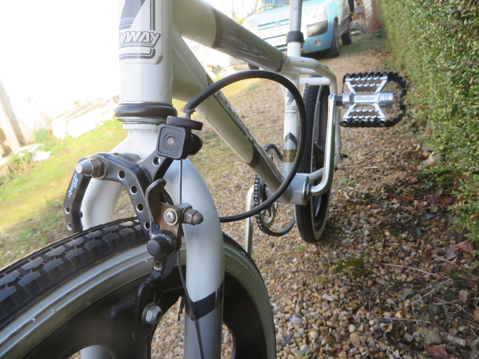 J'ai donc procédé au remontage et j'ai diverses galères: Le tirage par le bas est impossible sur mon frein. Ou alors y'a quelque chose que j'ai pas compris. Du coup ça fait un montage tout moche. Je galère également à ajuster les pneus: c'est écrit sur les jantes de gonfler à 40 psi pas plus, sur mon pneu 50. Je gonfle à 40 et mon flanc blanc ne ressort pas autant partout, comme si il était décentré par rapport à la roue.