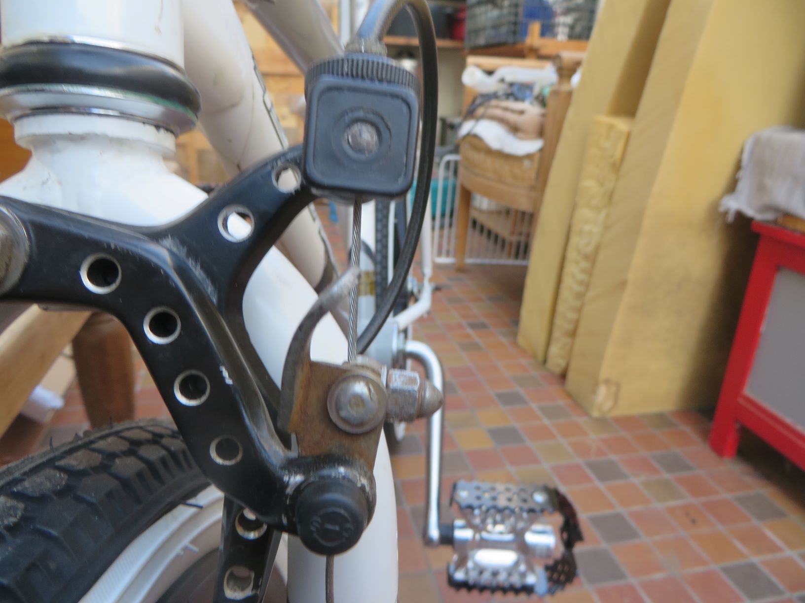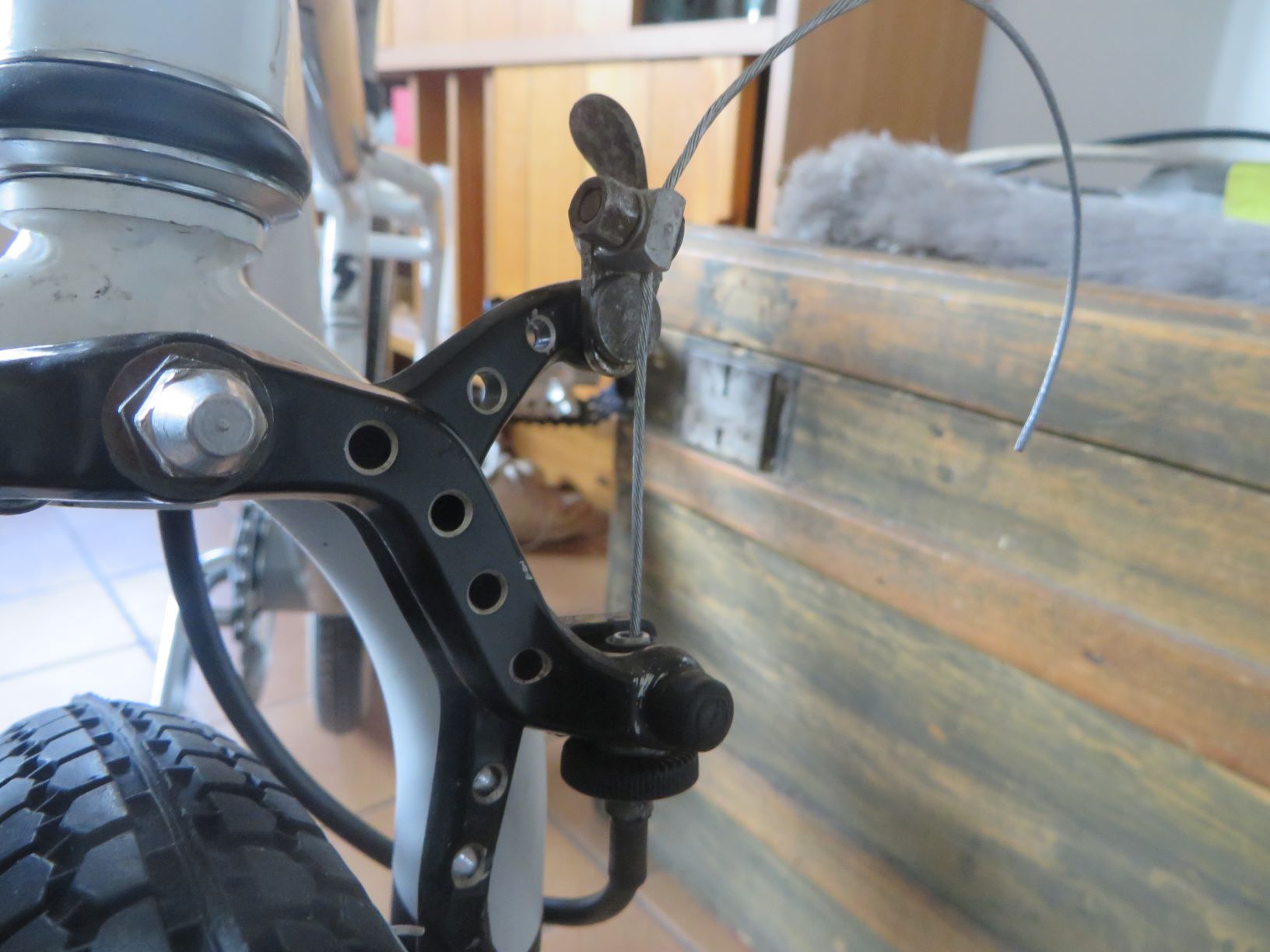 En ce qui concerne le frein, j'ai besoin d'aide. J'ai essayé le tirage par le bas: je passe mon câble dans la bague de serrage, sans la serrer car sinon ça entrainera mon étrier opposé vers l'extérieur quand j'actionnerai le levier. Je passe ensuite dans l'axe fileté mais j'ai rien pour bloquer mon câble après l'axe fileté. J'ai pensé échanger la position des deux pièces mais je ne peux pas desserrer l'écrou de l'ensemble bague de serrage. L'écrou tourne dans le vide.