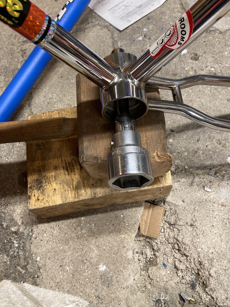 On fait avec les moyens du bord, il n’y a que la périphérie qui est légèrement enfoncée, un peu de délicatesse : douille de 36 et marteau !