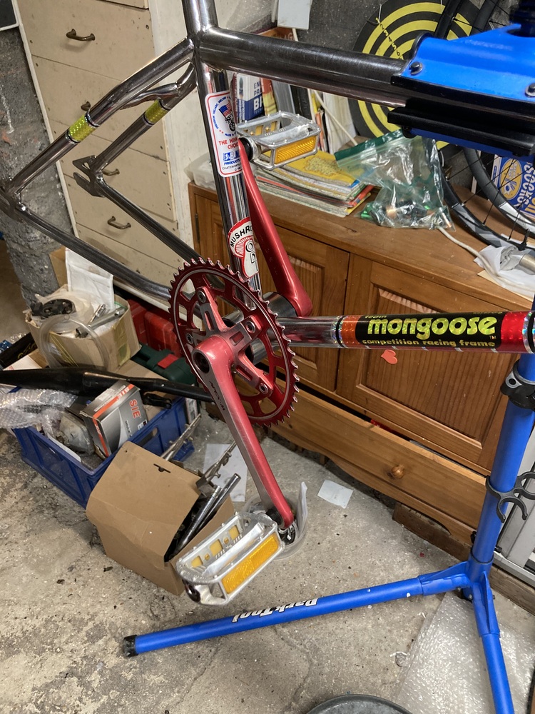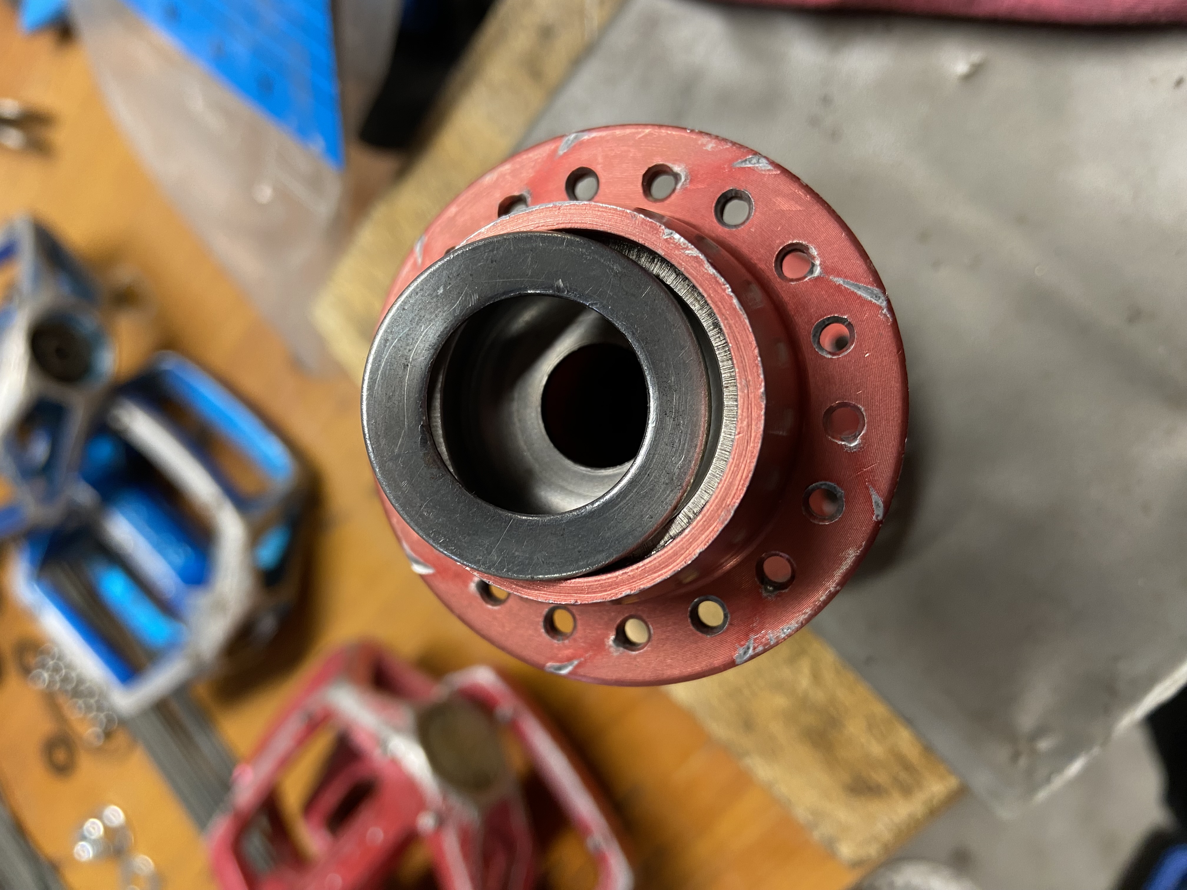 Axes morts, roulements également, moyeux anodisés rouge qui virent au rose….le tout bien crasseux.