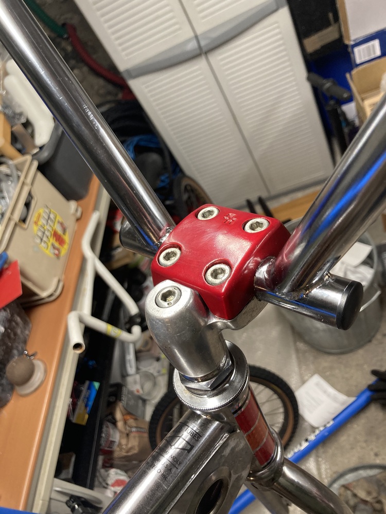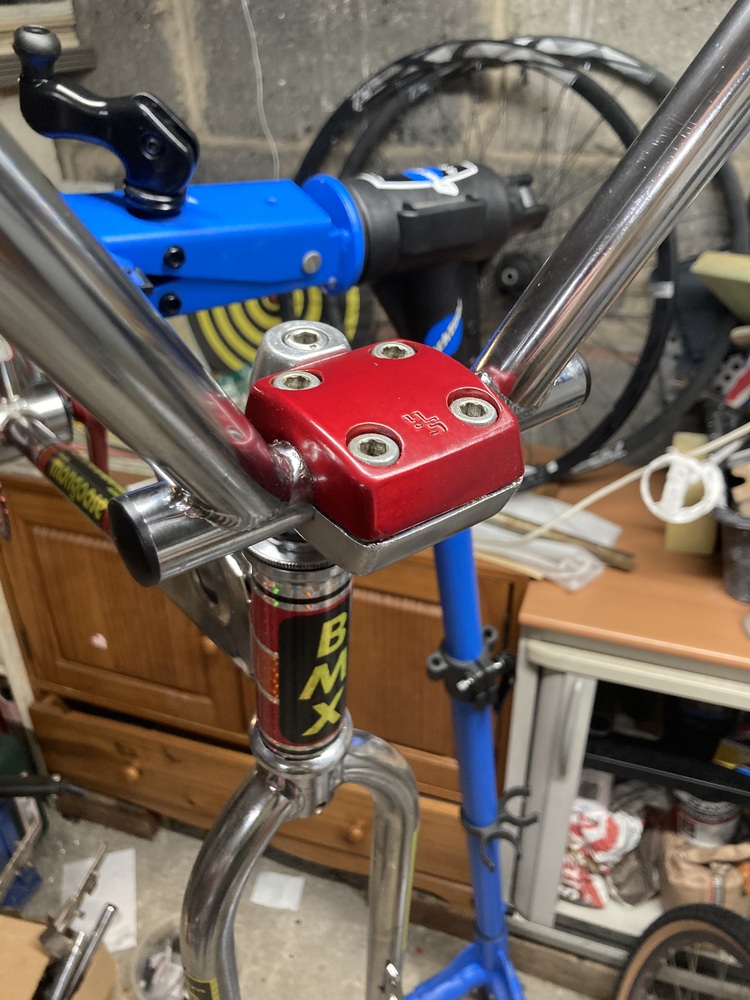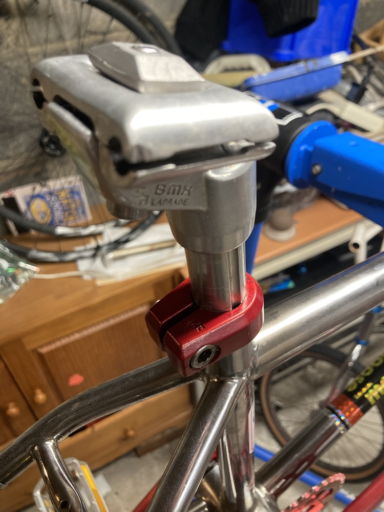 Et un peu de taf aujourd’hui, avec une bombe de vernis coloré rouge en centre auto: séchage ultra rapide et rendu proche de la teinte d’origine pour le collier de selle SR.