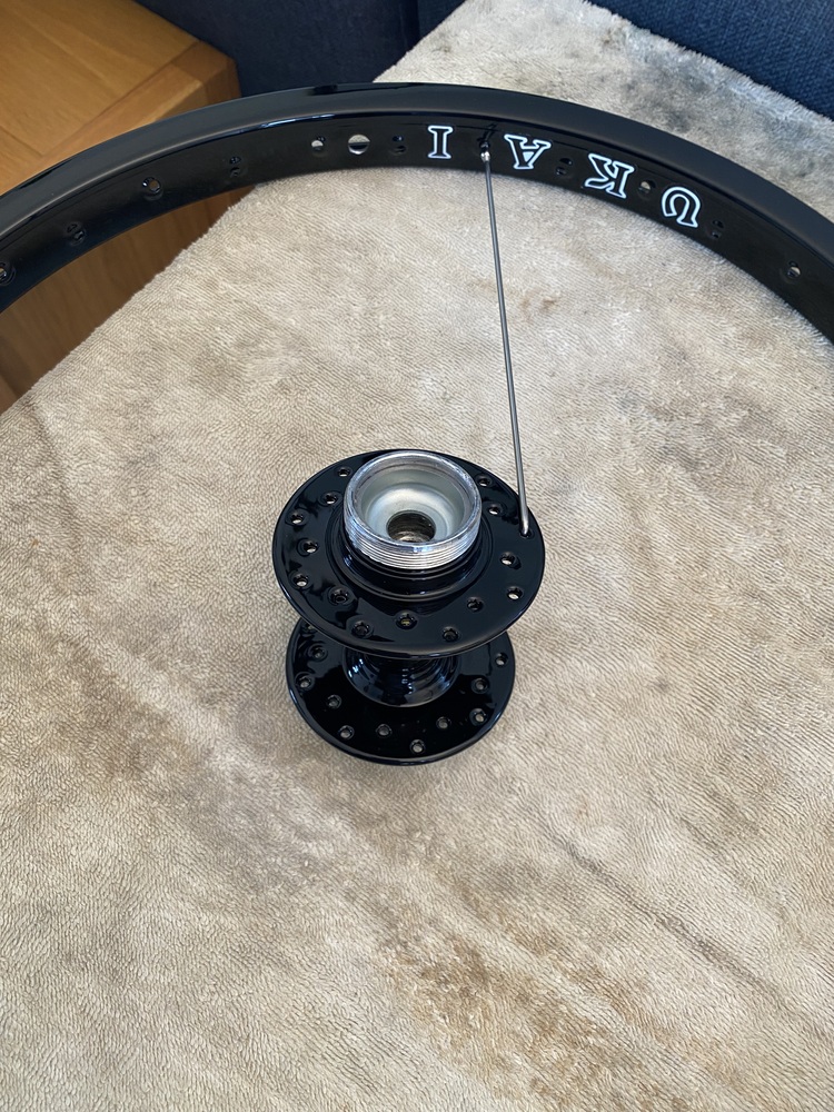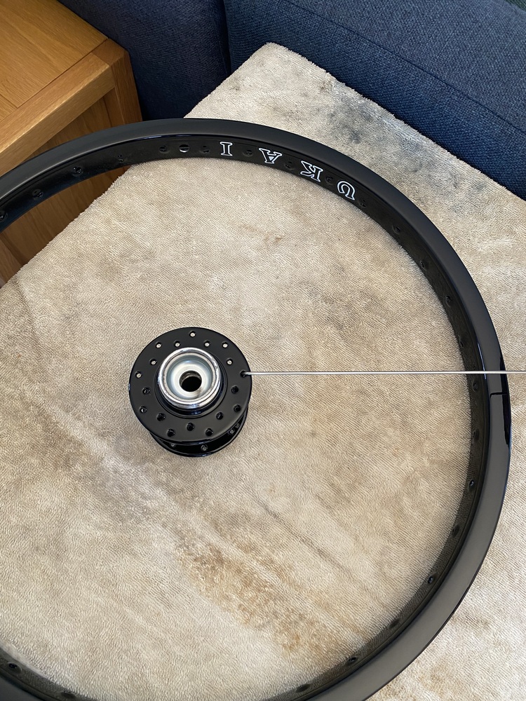 Idem l’autre côté en tournant bien le moyeux pour tendre les rayons et les positionner le plus tangents possible.