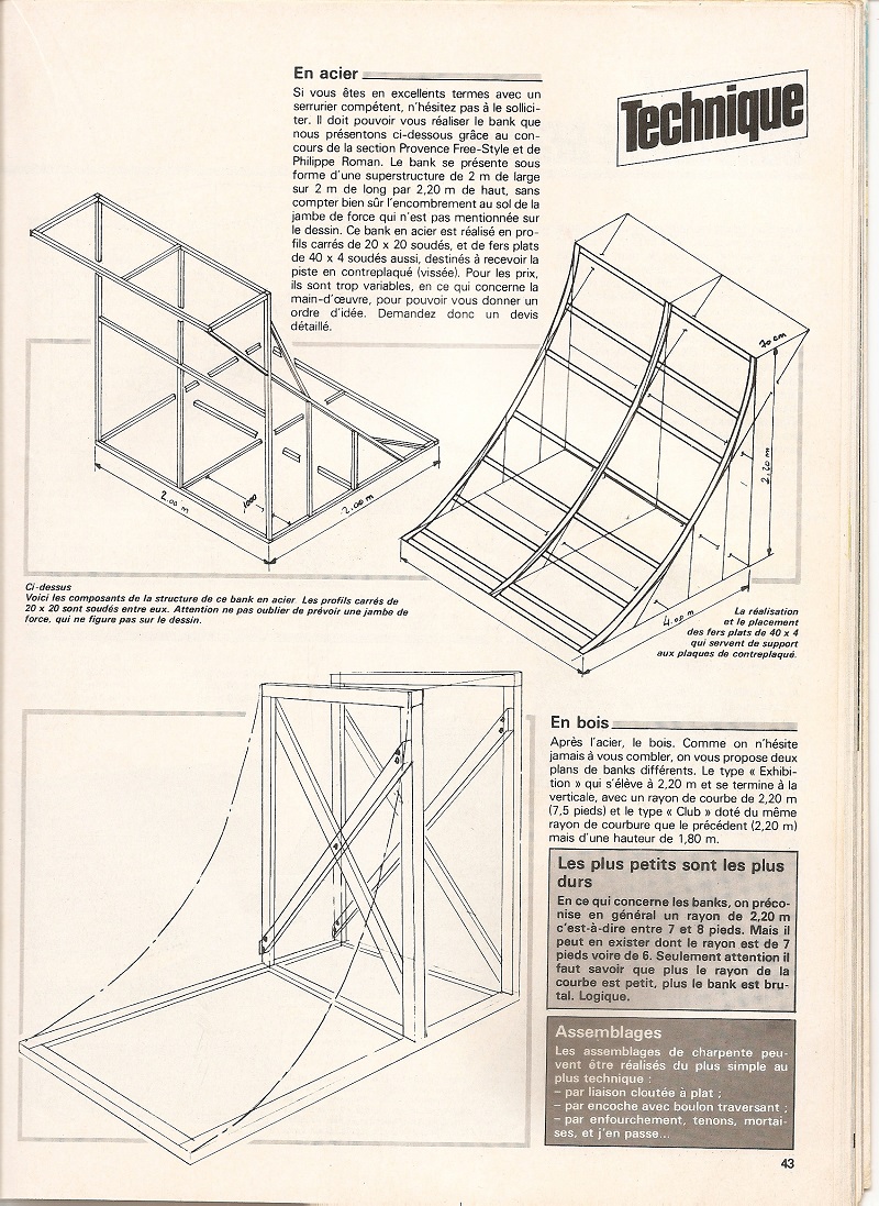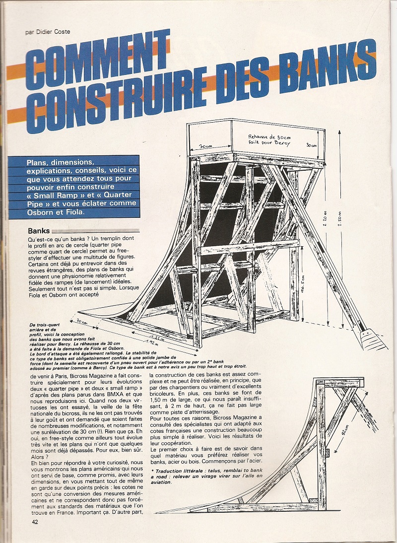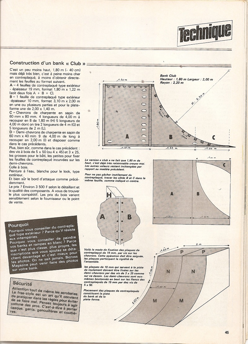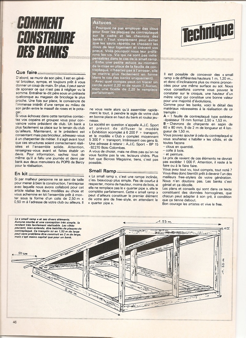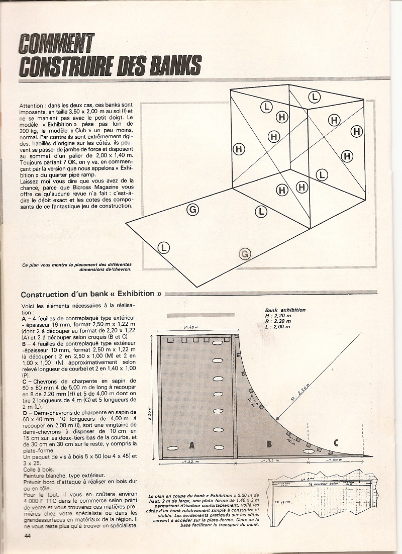 mes gamins veulent construire un quarter-pipe. J'ai donc cherché dans mes archives et j'ai trouvé ces plans, parus dans BXM et cette photo du bank construit avec mon paternel, il y a quelques décennies.