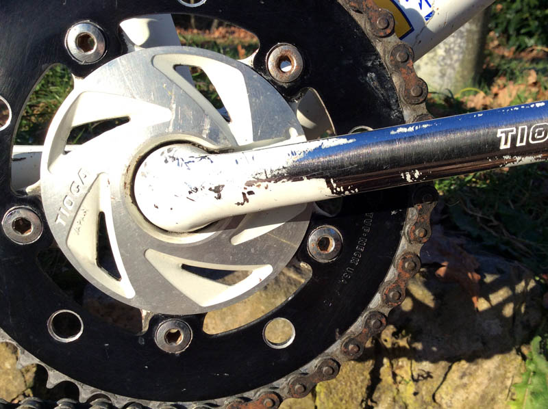 Ici, on voit que Suntour pour Tioga ne se faisait pas chier à masquer les filetages de manivelle de pédalier avant de peindre.