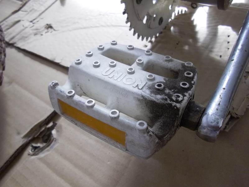 Sinon, le reste est là, les jantes Simplex, la jante arrière est voilée, de mémoire ça se redresse pas : quelqu'un peut confirmer ? Pareil, si quelqu'un en a une et n'en fait rien .... les pédales Union sont là aussi, très bon état...