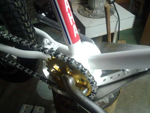 Il faudrait que tu lui trouves une fourche de vélo trial et peut-être d'autres freins, ce serait le top.