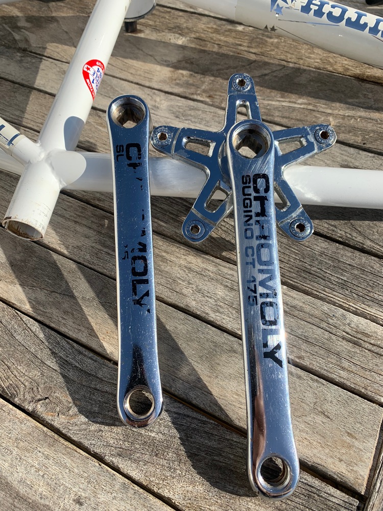 Les manivelles ont été traitées à l'huile de coude rapido en 7mn avec des gratouillis d'ongles, donc on devrait pas trop souffrir pour leur redonner fière allure. Je me tâte sur le fait de commander des transferts pour le lettrage, ou garder cette usure faite à coup de Vans d'ado de 1984... Le pédalier a fait trois vélos, Raleigh Aéro Pro, Cadre Pro Race 1, et cadre Pro Racer , donc il a bien tourné, l'usure est normale.