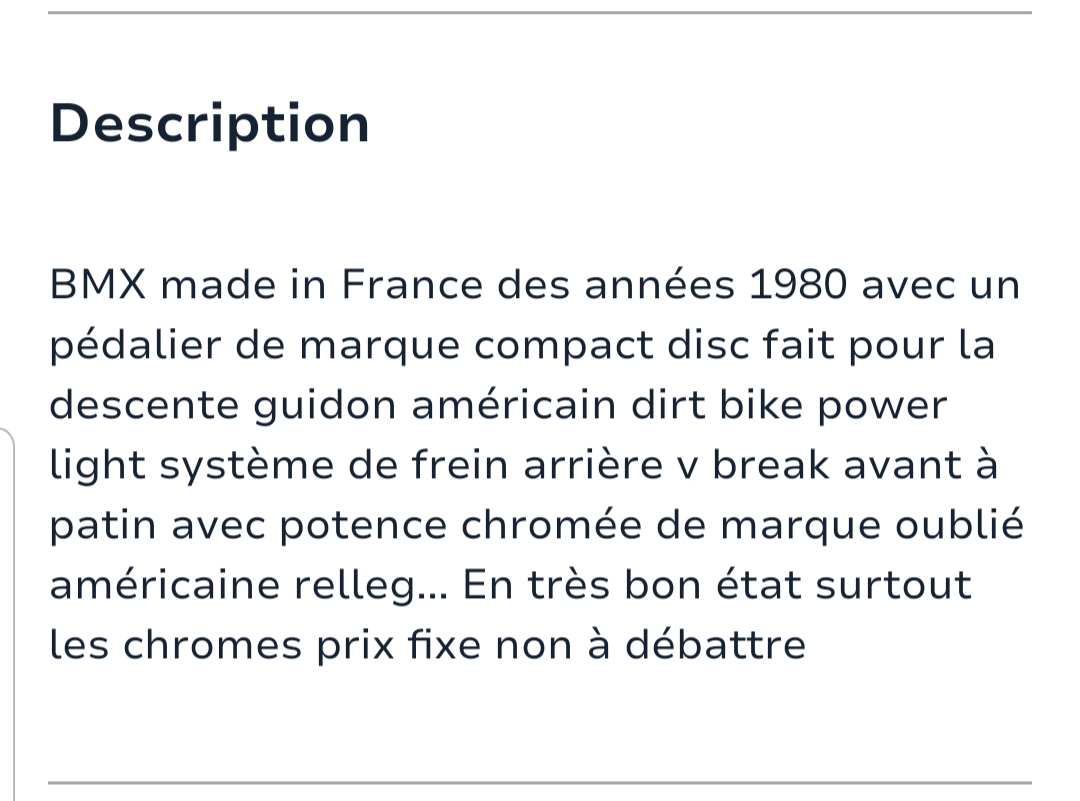 Dommage c était un très bon prixchris Hutchins a écrit : ↑21 juin 2024, 13:49Déjà vendu !poupa lee a écrit : ↑20 juin 2024, 22:01https://www.leboncoin.fr/ad/velos/2749587389