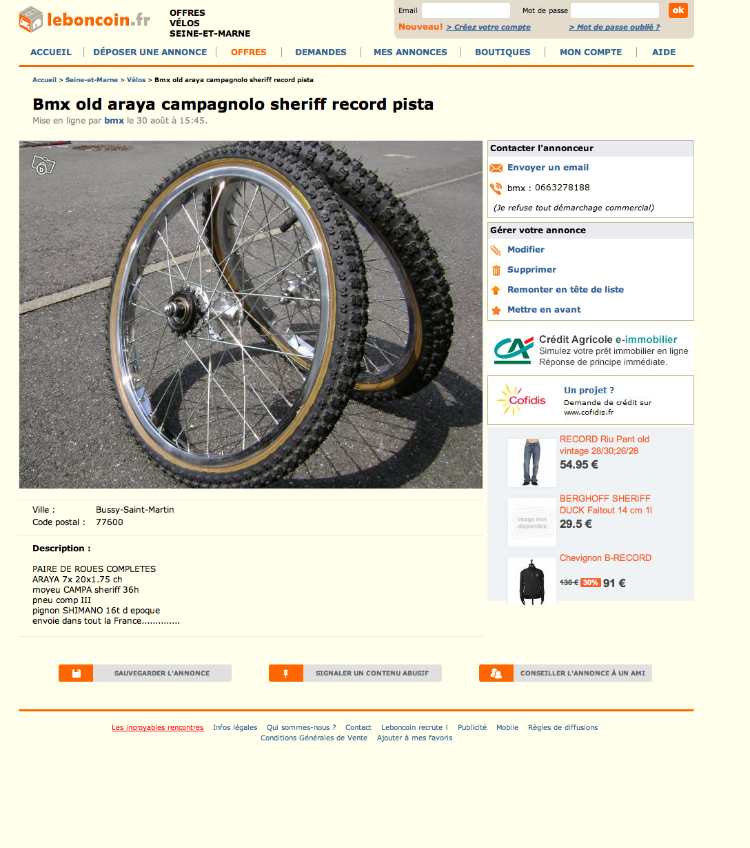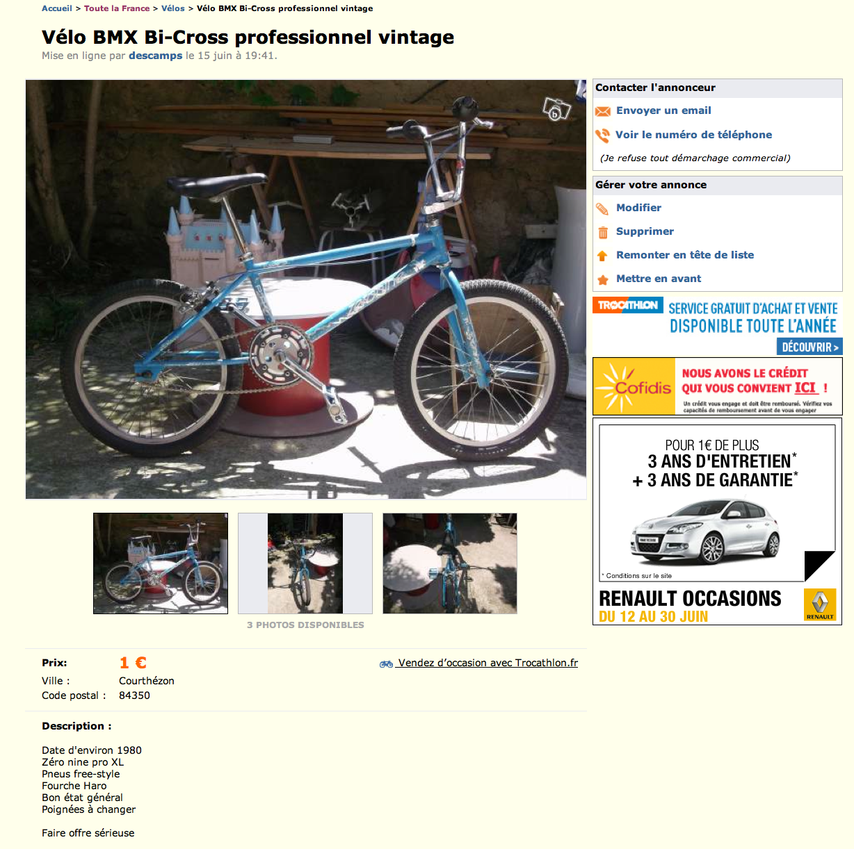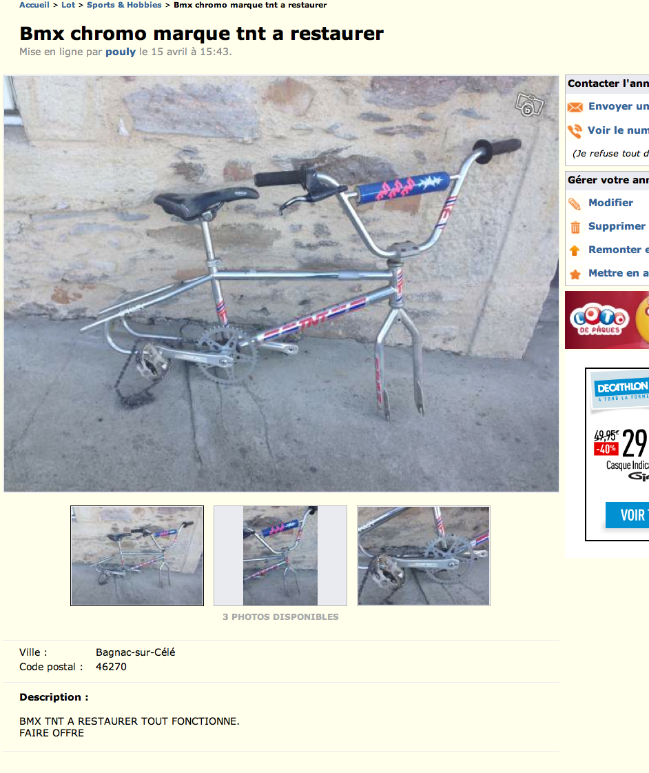 Ok, je vois. Par contre on peut pas comparer ça au musée, où tous les vélos appartiennent aux membres de ce forum et sont classés par marque, c'est bien rangé quoi. Là quand tu auras 100 pages sur ce topic, ca va etre un gros bordel pour retrouver une annonce en particulierSHAZZAM! a écrit :On conserve bien des photos de vélos dans un musée virtuel , parfois on peu comparer avec l'état du vélo lors de son achat .