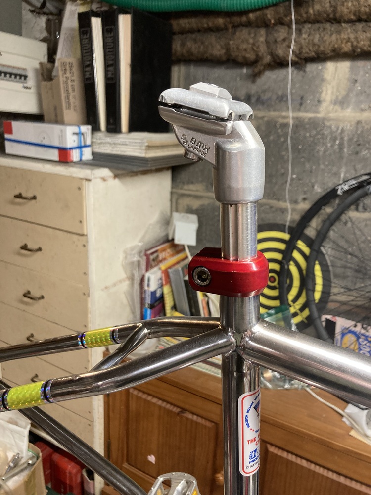 Et un peu de taf aujourd’hui, avec une bombe de vernis coloré rouge en centre auto: séchage ultra rapide et rendu proche de la teinte d’origine pour le collier de selle SR.