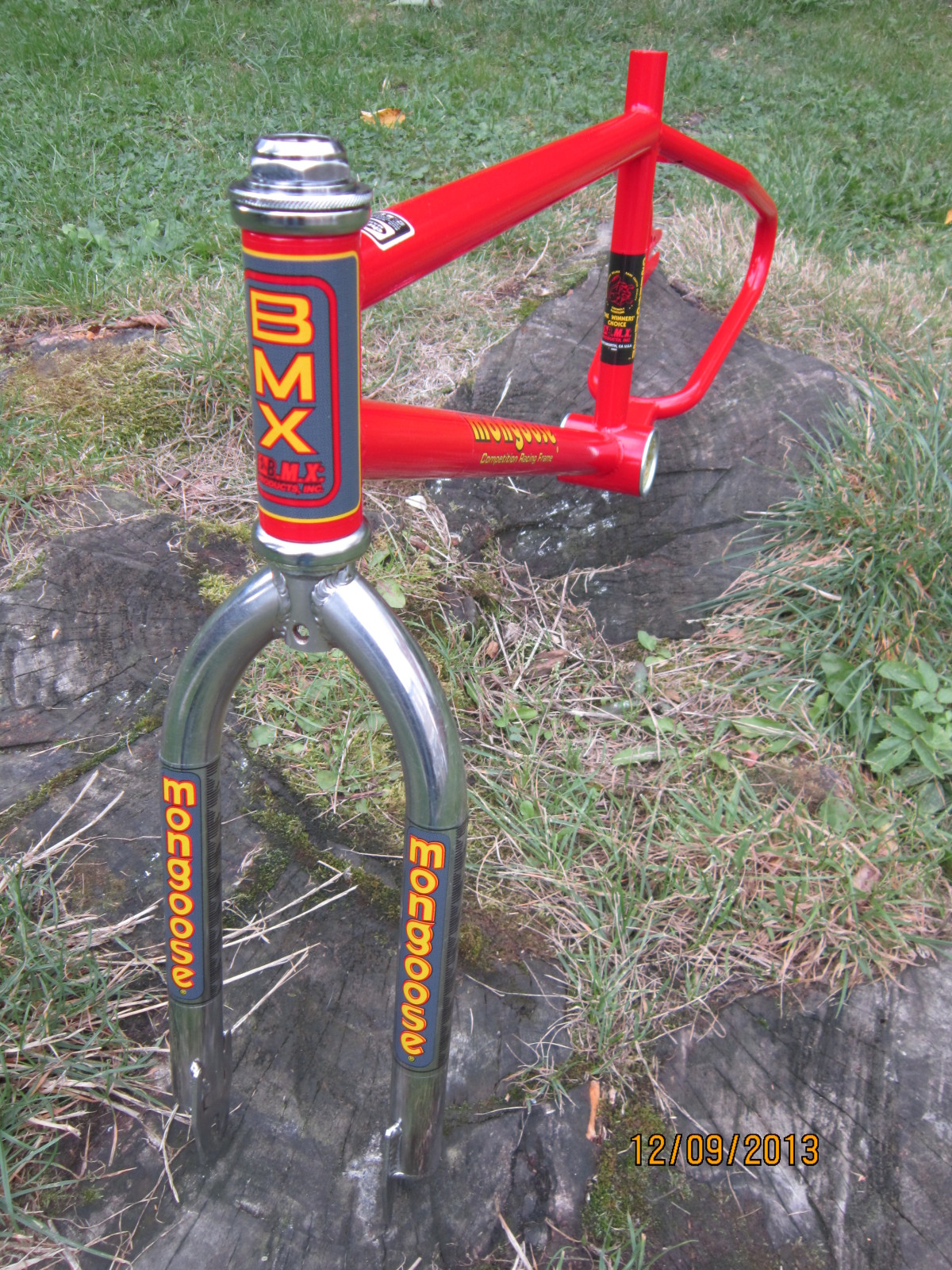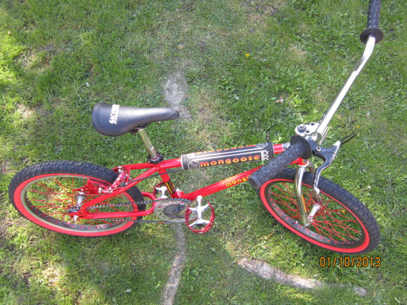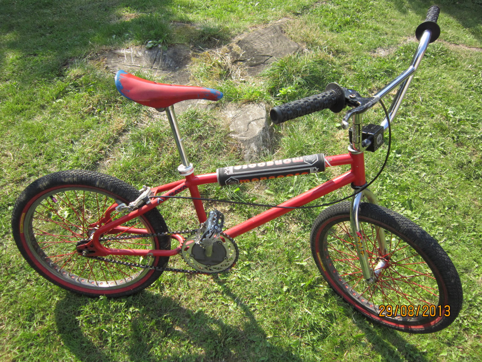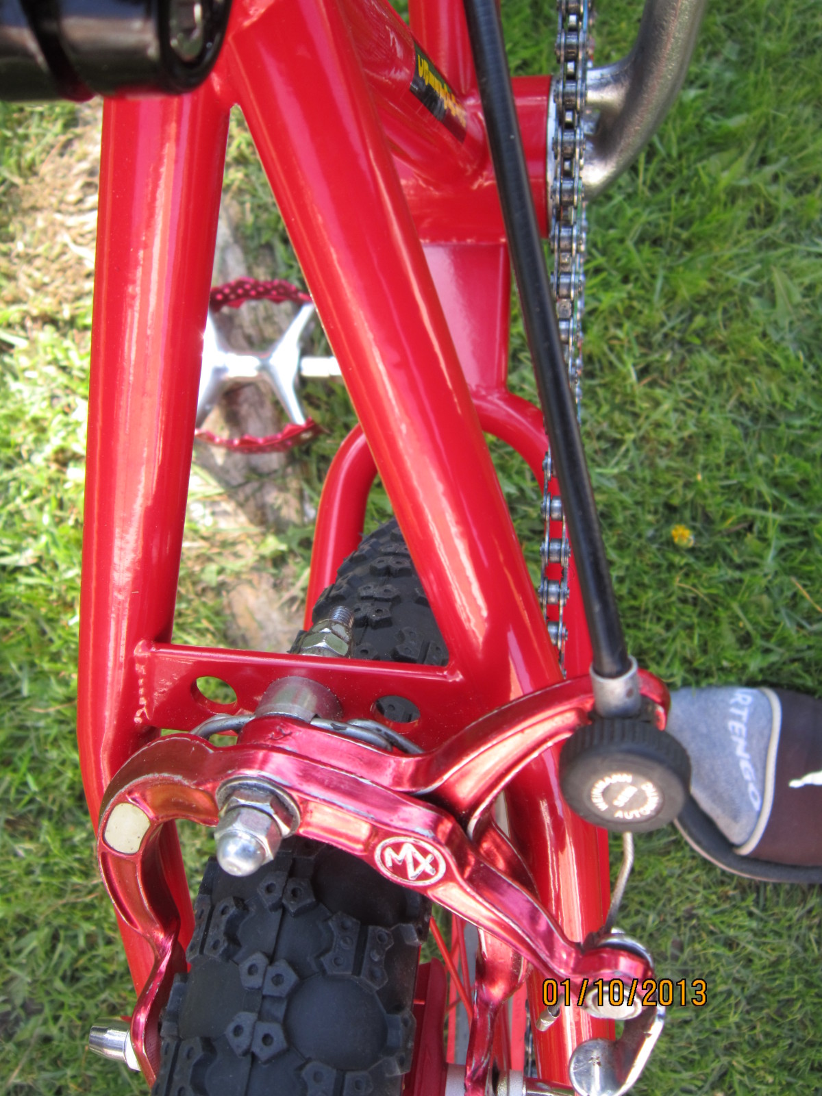 Le voici pour ainsi dire terminé,j'y aurai rajouté les stickers,remplacés roulements du pédalier,des roues,direction complète par des neufs ainsi que les axes Suzue.remplacé pa vieille Kashimax par une Skyway neuve et combien plus confortable d'après ma descendance...Moais.Les pédales par des Odyssey Shark Bite(de vrais dangers!)Changé le collier de selle pour un MX et la Machoire blanche du meme nom par une rouge anodisée qui trainait chez mes parents mais avec des patins Skyway récents très efficaces.J'ai remis la potence Tuff-Neck du Haro et l'ai rechaussé en Deli-Tyre à flancs rouges car j'aimais la touche qu'apportaient les flat Odyssey Bermuda et j'ai voulu la garder.Voilàles kids sont aux anges j'éspère qu'ils en auront autant de soin que leur père.Merci pour votre attention.