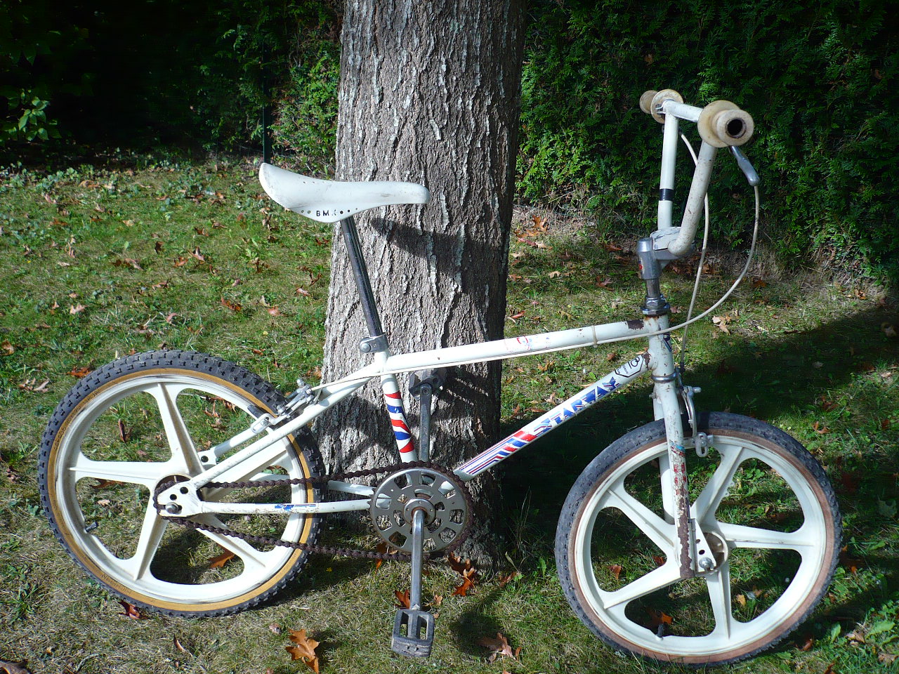 Salut à tous, sortie de garage de chez mes beaux parents, un vieux starway. Bon je sais qu'il est bien fatigué et que c'est plutôt du bas de gamme mais ce genre de vélo témoigne aussi de son époque! Tout le monde n'avait pas les moyens de rouler sur un Gt ou un Haro et il faut quand même avouer que ce genre de vélo sans noblesse a fait le bonheur d'un paquet de gosses.
