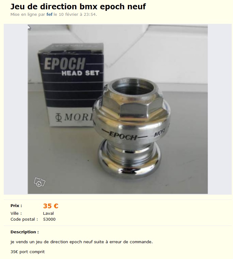 Donc il faut que je rachète un JDD noir (à bon entendeur si vous avez ça en stock epoch ou non ...) et j'ai un jeu de direction epoch neuf pour cadre junior à vendre 35€ FPI, c'est le prix que je l'ai payé